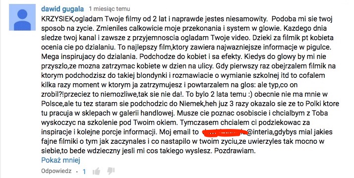 Teraz wiem już o co chodzi;) Zresztą pokazujesz to dobitnie na nagraniach… Tylko praktyka czyni mistrza a jestem przekonany, że ten materiał zaoszczędzi mi naprawdę masę niepowodzeń z kobietami i czasu. Dziękuję Ci Krzysiek ! Robisz zajebistą robotę. Możesz umieścić tą opinię gdzie tylko chcesz