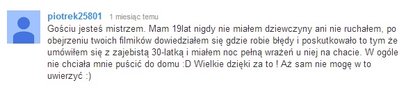 Cenię Cię za to, że jesteś jednym z niewielu który daje wiedzę na temat uwodzenia kobiet opartą o czystą praktykę. Oglądając ten materiał nie zawiodłem się a wręcz przeciwnie zdziwiłem. Nigdy bym nie przypuszczał, że trzeba rozmawiać z kobietami tak jak pokazujesz na nagraniu. Teraz widzę, że ja po prostu byłem zbyt miły, bałem się seksualnie żartować z kobietami. A kiedy próbowałem rozmawiać z dziewczynami o seksie robiłem to źle !